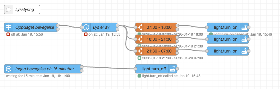 I oppholdsrom slås ikke lysene av automatisk, men slås på av bevegelse. For å skru av bruker vi en modusbryter ved hver av utgangene, for eksempel ved leggetid. Elles skrus lysene av etter en tid når alle har dratt hjemmefra og det ikke måles noen bevegelse i huset. Om natten har vi imidlertid en automasjon for å skru av lys automatisk. Alt dette styres i en flyt i Node-RED for hvert rom.